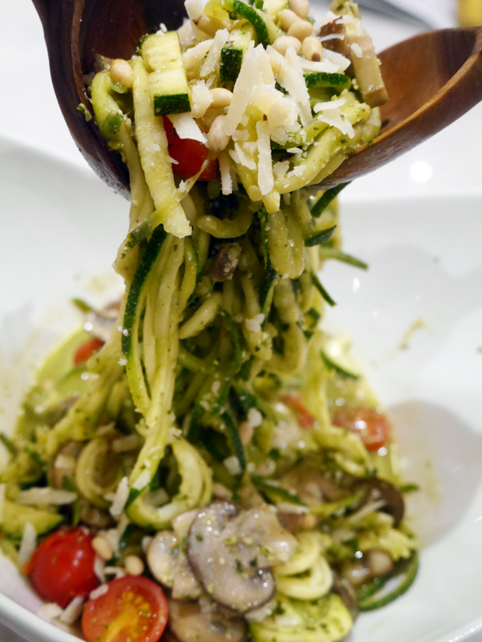 Dollop in about half of the pesto you have made and stir until all the courgetti strands are nicely coated. And hey pesto, you are done!