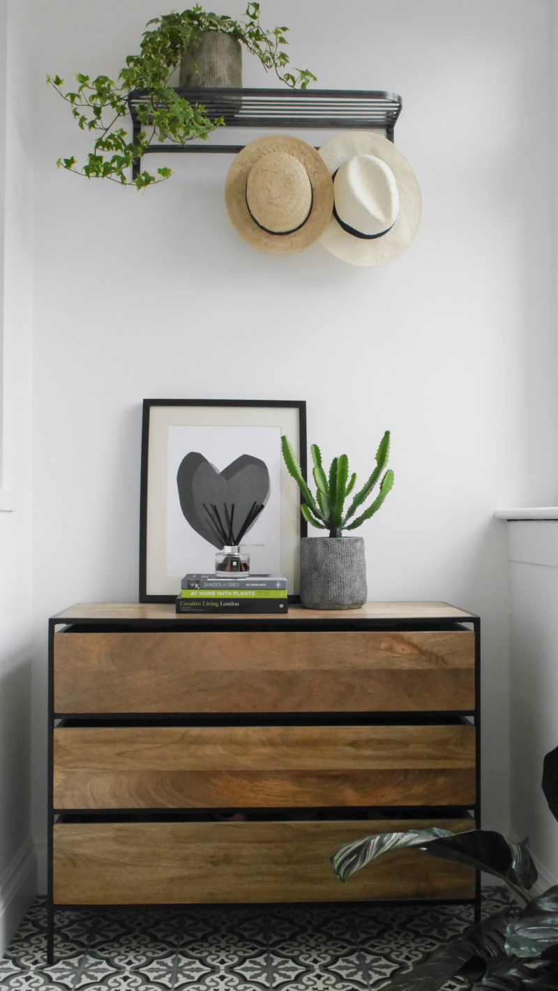 The metal shelf / hook rack is really just for decoration but will be handy if we have a party and we can store coats. Of course I had to add greenery and a vine and cactus seemed the hardy kind of creatures that might survive a bit of neglect.